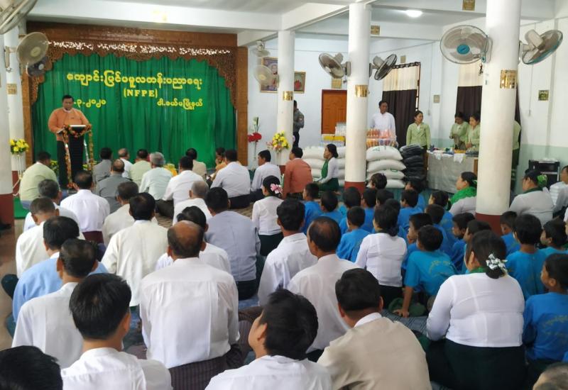 ဧရာဝတီတိုင်းဒေသကြီး မြောင်းမြခရိုင် ဝါးခယ်မမြို့နယ် လှေကျင်းရပ်ကွက် မဟာဓမိကာရုံကျောင်းတိုက်တွင် ယနေ့ နံနက် ၁၀ နာရီက ပြုလုပ်သော ၂၀၁၉ - ၂၀၂၀ ပညာသင်နှစ် ကျောင်းပြင်ပမူလတန်းပညာရေး (NFPE) ကျောင်းသား၊ ကျောင်းသူများအား ထောက်ပံ့ငွေနှင့် စာရေးကိရိယာ ပစ္စည်းများပေးအပ်ပွဲကို တိုင်းဒေသကြီးဝန်ကြီးချုပ်နှင့် တာဝန်ရှိသူများ တက်ရောက်ခဲ့ကြသည်။