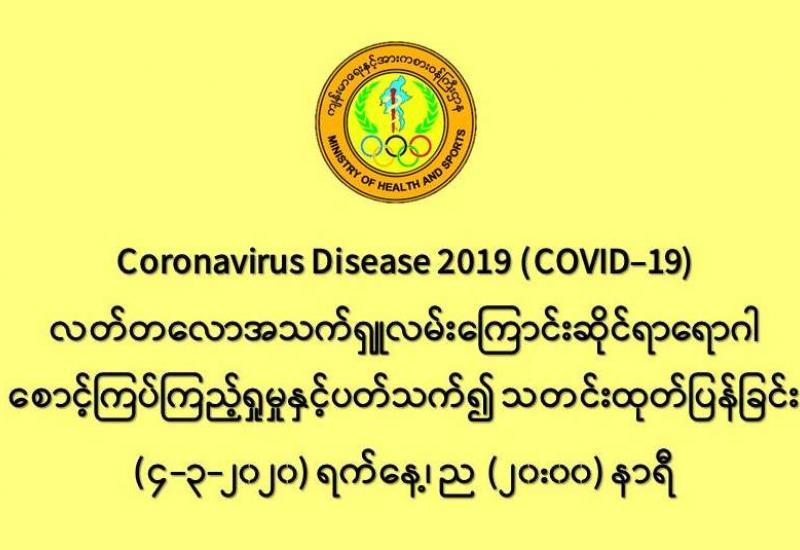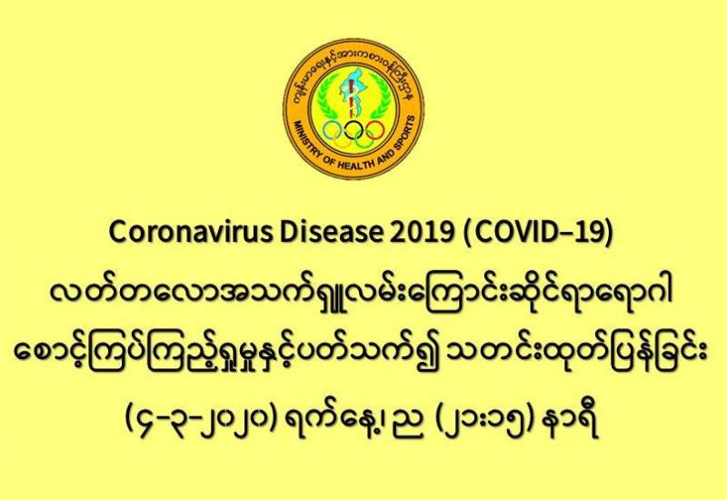 ၁။ ကျန်းမာရေးနှင့်အားကစားဝန်ကြီးဌာနသည် တရုတ်ပြည်သူ့သမ္မတနိုင်ငံနှင့် ကမ္ဘာ့နိုင်ငံ (၇၂) နိုင်ငံတွင် ကူးစက်ပျံ့နှံ့လျက်ရှိသည့် COVID-19 လတ်တလောအသက်ရှူလမ်းကြောင်းဆိုင်ရာ ရောဂါဖြစ်ပွားမှု ဖြစ်စဉ် နှင့်ပတ်သက်၍ ရောဂါစောင့်ကြပ်ကြည့်ရှုခြင်း လုပ်ငန်းများအား အပြည်ပြည်ဆိုင်ရာ ဝင်ပေါက်၊ ထွက်ပေါက် ဂိတ်များတွင်လည်းကောင်း၊ ဆေးရုံအခြေပြုအဖြစ်လည်းကောင်း၊ ပြည်သူလူထုအခြေပြု စောင့်ကြပ်ကြည့်ရှု ခြင်းလုပ်ငန်းများဖြင့်လည်းကောင်း၊ ပုဂ္ဂလိကဆေးရုံများ နှင့် ပူးပေါင်း၍လည်းကောင်း ဆောင်ရွက်လျက် ရှိပါသည်။
