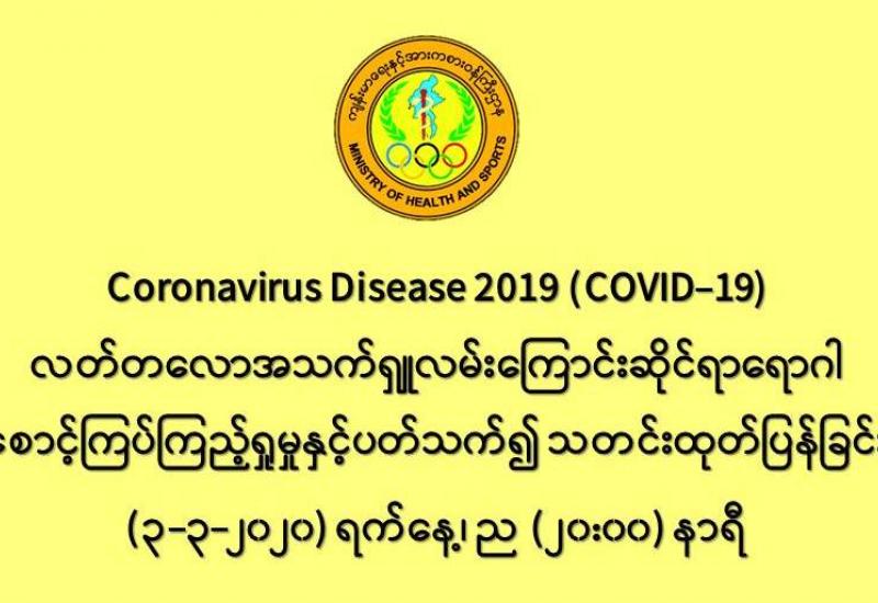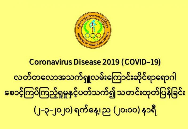 ၁။ ကျန်းမာရေးနှင့်အားကစားဝန်ကြီးဌာနသည် တရုတ်ပြည်သူ့သမ္မတနိုင်ငံနှင့် ကမ္ဘာ့နိုင်ငံ (၅၉) နိုင်ငံတွင် ကူးစက်ပျံ့နှံ့ လျက်ရှိသည့် COVID-19 ရောဂါဖြစ်ပွားမှုဖြစ်စဉ်နှင့်ပတ်သက်၍ ရောဂါစောင့်ကြပ်ကြည့်ရှုခြင်း လုပ်ငန်းများအား ဆောင်ရွက် လျက်ရှိရာ တွင် နိုင်ငံတကာ ကျန်းမာရေးဝန်ကြီးဌာနများနှင့်လည်းကောင်း၊ ကမ္ဘာ့ကျန်းမာရေးအဖွဲ့နှင့်လည်းကောင်း ချိတ်ဆက်၍ သတင်းပေးပို့ဖလှယ်ခြင်းများကို အချိန်နှင့်တစ်ပြေးညီ ဆောင်ရွက်လျက်ရှိပါသည်။