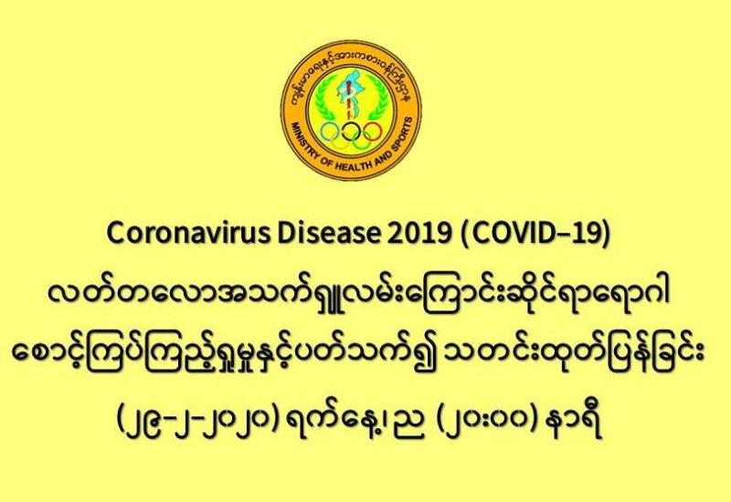 ၁။ ကျန်းမာရေးနှင့် အားကစားဝန်ကြီးဌာနသည် တရုတ်ပြည်သူ့သမ္မတနိုင်ငံနှင့် ကမ္ဘာ့နိုင်ငံအချို့တွင် ကူးစက်ပျံ့နှံ့လျက်ရှိသည့် COVID-19 လတ်တလောအသက်ရှူလမ်းကြောင်းဆိုင်ရာ ရောဂါ ဖြစ်ပွားမှု ဖြစ်စဉ်နှင့် ပတ်သက်၍ ရောဂါစောင့်ကြပ်ကြည့်ရှုခြင်း လုပ်ငန်းများအား အပြည်ပြည်ဆိုင်ရာ ဝင်ပေါက်၊ ထွက်ပေါက် ဂိတ်များတွင်လည်းကောင်း၊ ဆေးရုံအခြေပြု အဖြစ်လည်းကောင်း၊ ပြည်သူလူထုအခြေပြု စောင့်ကြပ်ကြည့်ရှုခြင်း လုပ်ငန်းများဖြင့်လည်းကောင်း၊ ပုဂ္ဂလိကဆေးရုံများနှင့် ပူးပေါင်း၍ လည်းကောင်း ဆောင်ရွက်လျက်ရှိပါသည်။