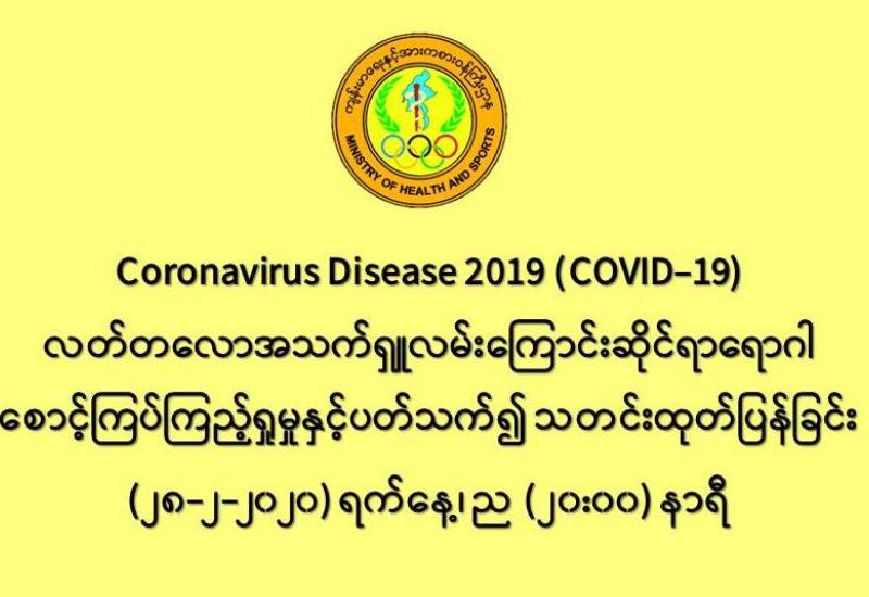 ၁။ ကျန်းမာရေးနှင့်အားကစားဝန်ကြီးဌာနသည် တရုတ်ပြည်သူ့သမ္မတနိုင်ငံနှင့် ကမ္ဘာ့နိုင်ငံအချို့တွင် ကူးစက်ပျံ့နှံ့လျက်ရှိသည့် COVID-19 လတ်တလောအသက်ရှူလမ်းကြောင်းဆိုင်ရာ ရောဂါ ဖြစ်ပွားမှုဖြစ်စဉ်နှင့်ပတ်သက်၍ ရောဂါစောင့်ကြပ်ကြည့်ရှုခြင်း လုပ်ငန်းများအား အပြည်ပြည်ဆိုင်ရာ ဝင်ပေါက်၊ ထွက်ပေါက်ဂိတ်များတွင်လည်းကောင်း၊ ဆေးရုံအခြေပြုအဖြစ်လည်းကောင်း၊ ပြည်သူ လူထုအခြေပြု စောင့်ကြပ်ကြည့်ရှုခြင်းလုပ်ငန်းများဖြင့်လည်းကောင်း၊ ပုဂ္ဂလိကဆေးရုံများနှင့် ပူးပေါင်း၍လည်းကောင်း ဆောင်ရွက်လျက်ရှိပါသည်။