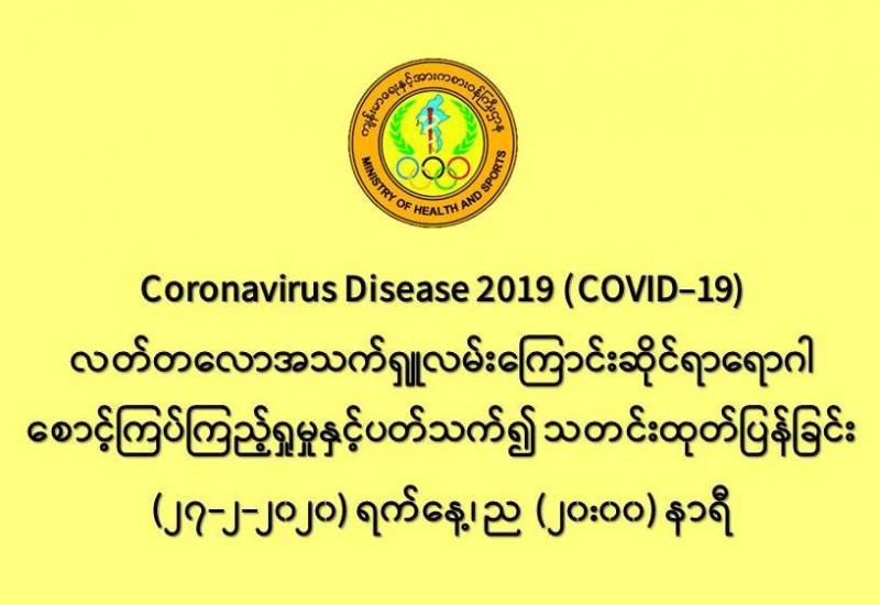 ၁။ ကျန်းမာရေးနှင့်အားကစားဝန်ကြီးဌာနသည် တရုတ်ပြည်သူ့သမ္မတနိုင်ငံနှင့် ကမ္ဘာ့နိုင်ငံအချို့ တွင် ကူးစက်ပျံ့နှံ့လျက်ရှိသည့် COVID-19 လတ်တလောအသက်ရှူလမ်းကြောင်းဆိုင်ရာ ရောဂါ ဖြစ်ပွားမှုဖြစ်စဉ်နှင့်ပတ်သက်၍ ရောဂါစောင့်ကြပ်ကြည့်ရှုခြင်း လုပ်ငန်းများအား အပြည်ပြည်ဆိုင်ရာ ဝင်ပေါက်၊ ထွက်ပေါက်ဂိတ်များတွင်လည်းကောင်း၊ ဆေးရုံအခြေပြုအဖြစ်လည်းကောင်း၊ ပြည်သူ လူထုအခြေပြု စောင့်ကြပ်ကြည့်ရှုခြင်းလုပ်ငန်းများဖြင့်လည်းကောင်း၊ ပုဂ္ဂလိကဆေးရုံများနှင့် ပူးပေါင်း၍လည်းကောင်း ဆောင်ရွက်လျက်ရှိပါသည်။