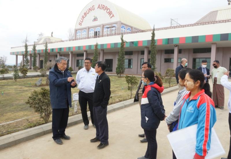 ဂျပန်လေကြောင်းပညာရှင် Strengthening of Civil Aviation Safety Oversight in the Republic of the Union of Myanmar Project မှ Akira HAHRDA ဦးဆောင်သော ပညာရှင်များသည် ချင်းပြည်နယ်အစိုးရအဖွဲ့ဝင် ပြည်နယ် လမ်းပန်းဆက်သွယ်ရေးဝန်ကြီး ဦးရွှေထီးအို၊ ဖလမ်းမြို့နယ် အုပ်ချုပ်ရေးမှူး ဦးကြားအွယ် တို့နှင့်အတူ ယမန်နေ့ နံနက်ပိုင်းက ဆူရ်ဘုန်လေဆိပ် စီမံကိန်းအား ကြည့်ရှုစစ်ဆေးသည်။