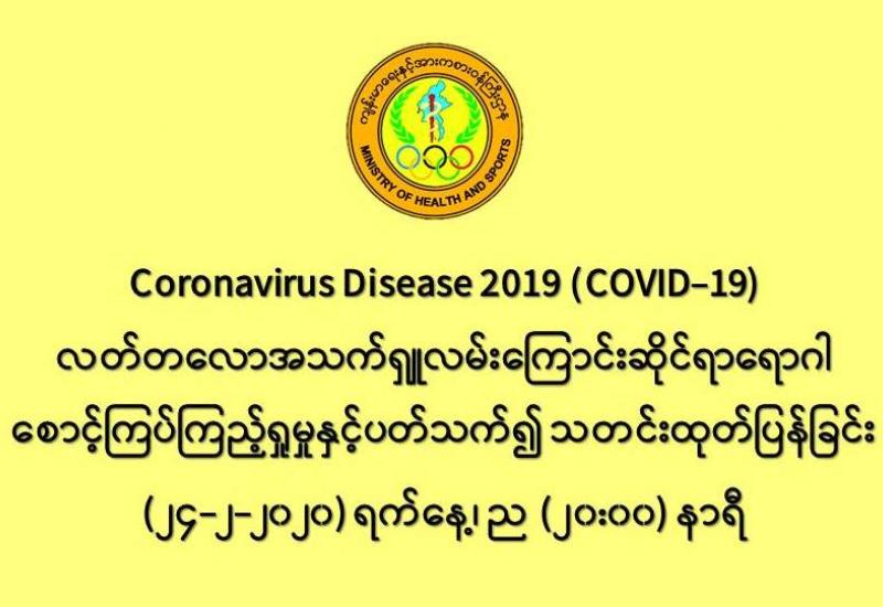 ၁။ ကျန်းမာရေးနှင့်အားကစားဝန်ကြီးဌာနသည် တရုတ်ပြည်သူ့သမ္မတနိုင်ငံနှင့် ကမ္ဘာ့နိုင်ငံအချို့ တွင် ကူးစက်ပျံ့နှံ့လျက်ရှိသည့် COVID-19 လတ်တလောအသက်ရှူလမ်းကြောင်းဆိုင်ရာ ရောဂါ ဖြစ်ပွားမှုဖြစ်စဉ်နှင့်ပတ်သက်၍ ရောဂါစောင့်ကြပ်ကြည့်ရှုခြင်း လုပ်ငန်းများအား အပြည်ပြည်ဆိုင်ရာ ဝင်ပေါက်၊ ထွက်ပေါက်ဂိတ်များတွင်လည်းကောင်း၊ ဆေးရုံအခြေပြုအဖြစ်လည်းကောင်း၊ ပြည်သူ လူထုအခြေပြု စောင့်ကြပ်ကြည့်ရှုခြင်းလုပ်ငန်းများဖြင့်လည်းကောင်း၊ ပုဂ္ဂလိကဆေးရုံများနှင့် ပူးပေါင်း၍လည်းကောင်း ဆောင်ရွက်လျက်ရှိပါသည်။