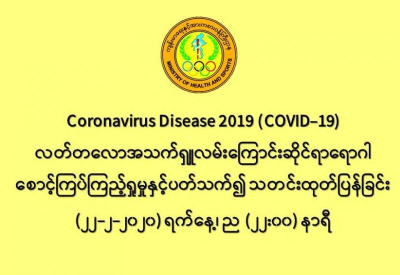 ၁။ ကျန်းမာရေးနှင့်အားကစားဝန်ကြီးဌာနသည် တရုတ်ပြည်သူ့သမ္မတနိုင်ငံနှင့် ကမ္ဘာ့နိုင်ငံအချို့တွင် ကူးစက်ပျံ့နှံ့လျက် ရှိသည့် COVID-19 လတ်တလောအသက်ရှူလမ်းကြောင်းဆိုင်ရာရောဂါ ဖြစ်ပွားမှုဖြစ်စဉ်နှင့်ပတ်သက်၍ ရောဂါ စောင့်ကြပ်ကြည့်ရှုခြင်း လုပ်ငန်းများအား ဆောင်ရွက်လျက်ရှိရာတွင် အပြည်ပြည်ဆိုင်ရာ ကျန်းမာရေးပြဌာန်းချက် ဆက်သွယ်ရေးအရာရှိ (International Health Regulation (IHR) focal point) များနှင့် ချိတ်ဆက်၍ သတင်းပေးပို့ဖလှယ်ခြင်းများကို ဆောင်ရွက်လျက်ရှိပါသည်။