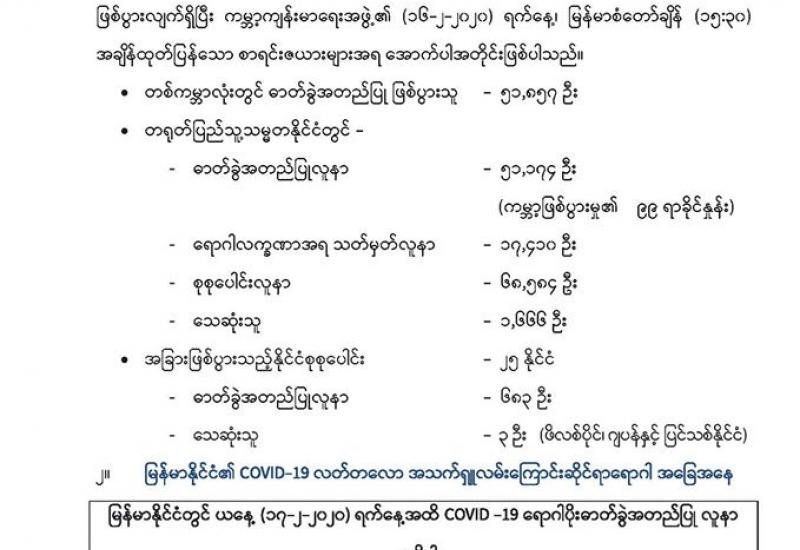 ၁။ ကျန်းမာရေးနှင့်အားကစားဝန်ကြီးဌာနသည် တရုတ်ပြည်သူ့သမ္မတနိုင်ငံနှင့် ကမ္ဘာ့နိုင်ငံ အချို့တွင် ကူးစက်ပျံ့နှံ့လျက်ရှိသည့် COVID-19 လတ်တလောအသက်ရှူလမ်းကြောင်းဆိုင်ရာ ရောဂါ ဖြစ်ပွားမှုဖြစ်စဉ်နှင့်ပတ်သက်၍ ရောဂါစောင့်ကြပ်ကြည့်ရှူခြင်း လုပ်ငန်းများအား အပြည် ပြည်ဆိုင်ရာဝင် ထွက်ဂိတ်များတွင်လည်းကောင်း၊ ဆေးရုံအခြေပြုအဖြစ်လည်းကောင်း၊ ပြည်သူ လူထုအခြေပြု စောင့်ကြပ်ကြည့်ရှုခြင်း လုပ်ငန်းများဖြင့်လည်းကောင်း၊ ပုဂ္ဂလိကဆေးရုံများနှင့် ပူးပေါင်း၍ လည်းကောင်း ဆောင်ရွက်လျက်ရှိပါသည်။
