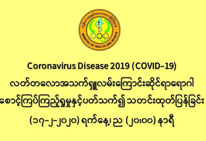 ကမ္ဘာ့နိုင်ငံ ၂၆ နိုင်ငံ၌ ဖြစ်ပွားနေသည့် ကိုရိုနာဗိုင်းရပ်စ် လတ်တလော အသက်ရှူလမ်းကြောင်းဆိုင်ရာ ကူးစက်ရောဂါမှာ မြန်မာနိုင်ငံတွင် ကူးစက်ပျံ့နှံ့ဖြစ်ပွားခြင်းမရှိသေးသော်လည်း ကြိုတင်တားဆီး ကာကွယ်ကုသရေး လုပ်ငန်းများကို ထိထိရောက်ရောက် လုပ်ကိုင်ပေးနေသည်။