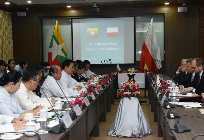 ပထမအကြိမ် မြန်မာ-ပိုလန် နှစ်နိုင်ငံ နိုင်ငံခြားရေးဝန်ကြီးဌာနများအကြား ဆွေးနွေးပွဲကို ယနေ့ နံနက်ပိုင်းက နေပြည်တော်ရှိ နိုင်ငံခြားရေး ဝန်ကြီးဌာန အစည်းအဝေးခန်းမ၌ ကျင်းပသည်။