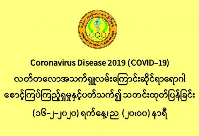 ၁။ ကျန်းမာရေးနှင့်အားကစားဝန်ကြီးဌာနသည် တရုတ်ပြည်သူ့သမ္မတနိုင်ငံနှင့် ကမ္ဘာ့နိုင်ငံ အချို့တွင် ကူးစက်ပျံ့နှံ့လျက်ရှိသည့် COVID-19 လတ်တလောအသက်ရှူလမ်းကြောင်းဆိုင်ရာ ရောဂါ ဖြစ်ပွားမှုဖြစ်စဉ်နှင့်ပတ်သက်၍ ရောဂါစောင့်ကြပ်ကြည့်ရှုခြင်း လုပ်ငန်းများအား အပြည် ပြည်ဆိုင်ရာဝင် ထွက်ဂိတ်များတွင်လည်းကောင်း၊ ဆေးရုံအခြေပြုအဖြစ်လည်းကောင်း၊ ပြည်သူ လူထုအခြေပြု စောင့်ကြပ်ကြည့်ရှုခြင်း လုပ်ငန်းများဖြင့်လည်းကောင်း၊ ပုဂ္ဂလိကဆေးရုံများနှင့် ပူးပေါင်း၍ လည်းကောင်း ဆောင်ရွက်လျက်ရှိပါသည်။