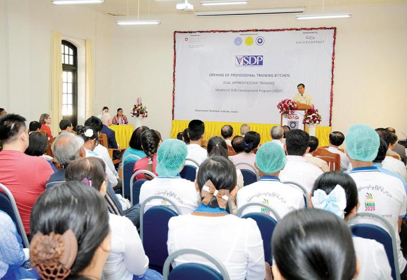 ပညာရေးဝန်ကြီးဌာန၊ နည်းပညာ၊ သက်မွေးပညာနှင့် လေ့ကျင့်ရေးဦးစီးဌာနနှင့် ဖွံ့ဖြိုးမှုမိတ်ဖက် အဖွဲ့အစည်းဖြစ်သည့် Swiss Agency for Development and Cooperation (SDC)တို့ ပူးပေါင်း၍ အစိုးရစက်မှုလက်မှုသိပ္ပံ (အင်းစိန်)တွင် ဖွင့်လှစ်ထားသည့် သက်မွေးပညာ ကျွမ်းကျင်မှု ဆိုင်ရာလေ့ကျင့်ရေး စားဖိုဆောင် (Professional Training Kitchen) ဖွင့်ပွဲအခမ်းအနားကို ယမန်နေ့က ရန်ကုန်တိုင်းဒေသကြီး အင်းစိန်မြို့နယ်ရှိ အစိုးရစက်မှုလက်မှုသိပ္ပံ (အင်းစိန်)တွင် ကျင်းပသည်။