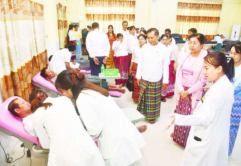 ဇူလိုင် ၃ ရက်တွင်ကျရောက်မည့် မြန်မာအမျိုးသမီးများနေ့ကို ကြိုဆိုဂုဏ်ပြုသောအားဖြင့် ပြည်ထောင်စုစာရင်းစစ်ချုပ်ရုံး ဝန်ထမ်းများ၏ စုပေါင်းသွေးလှူဒါန်းပွဲကို ယမန်နေ့နံနက်ပိုင်းက နေပြည်တော်အထွေထွေရောဂါကုဆေးရုံကြီး (ခုတင်-၁၀၀၀)၌ ကျင်းပရာ ပြည်ထောင်စုစာရင်းစစ်ချုပ် ဒေါက်တာခင်နိုင်ဦး တက်ရောက်ကြည့်ရှုအားပေးသည်။