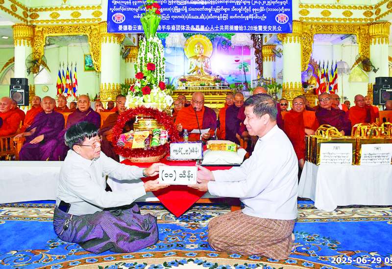 မန္တလေးတိုင်းဒေသကြီး မြို့နယ်ခုနစ်မြို့နယ်ရှိ ငလျင်ဘေးသင့်သံဃာတော်များနှင့် သီလရှင်စုစုပေါင်း အပါး ၁၁၁၀၀ အတွက် မန္တလေးယူနန် ဗုဒ္ဓဘာသာ ဘုရားကျောင်း၊ မြန်မာပြည်ဖွား တရုတ်မျိုးနွယ်စုနှင့် စေတနာရှင်များစုပေါင်း၍ ဆန်၊ ဆီ၊ ကုလားပဲများ လှူဒါန်းပွဲအခမ်းအနားကို ယနေ့နံနက်ပိုင်းတွင် ချမ်းအေးသာစံမြို့နယ် မာန်အောင်ရတနာစေတီတော် ဝါခင်းကုန်းဘုရားရှိ သိန်းသန်းရတနာ သာသနာ့ဗိမာန်တော်ကြီး၌ ကျင်းပသည်။