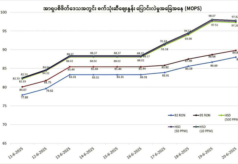 ယခုသီတင်းပတ်ကာလများအတွင်း ကမ္ဘာ့ရေနံဈေးနှုန်းမြင့်တက်မှုနှင့်အတူ အာရှပစိဖိတ်ဒေသအတွင်း စက်သုံးဆီဈေးနှုန်းများသည် တစ်စည်လျှင် ၁၀ ဒေါ်လာမှ ၁၅ ဒေါ်လာခန့်အထိ မြင့်တက်ခဲ့သဖြင့် ပြည်တွင်းစက်သုံးဆီဈေးနှုန်းများလည်း မြင့်တက်ခဲ့ကြောင်း၊