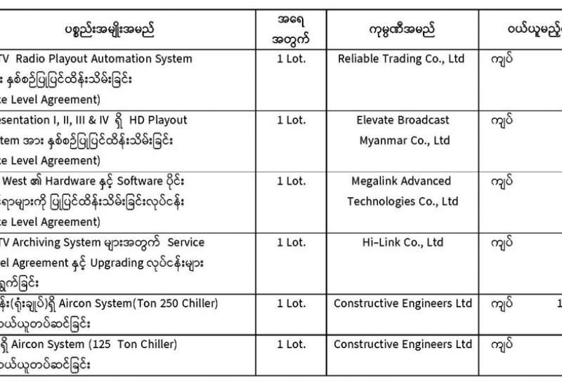 မြန်မာ့အသံနှင့်ရုပ်မြင်သံကြား၏ ၂၀၂၅-၂၀၂၆ ဘဏ္ဍာရေးနှစ်၊ စက်ပစ္စည်းများဝယ်ယူရေးအတွက် ( ၁၉ - ၆ - ၂၀၂၅) ရက်နေ့တွင် ပြန်ကြားရေးဝန်ကြီးဌာန၊ ပြည်တွင်း/ပြည်ပပစ္စည်းများ ဝယ်ယူရေးနှင့် ထုခွဲရောင်းချရေးကော်မတီမှ ဈေးနှုန်းစိစစ်ခဲ့ရာ ဖော်ပြပါကုမ္ပဏီများမှ ဈေးနှုန်းအနည်းဆုံးဖြင့် မှတ်တမ်းတင်ထားရှိပါသည် -