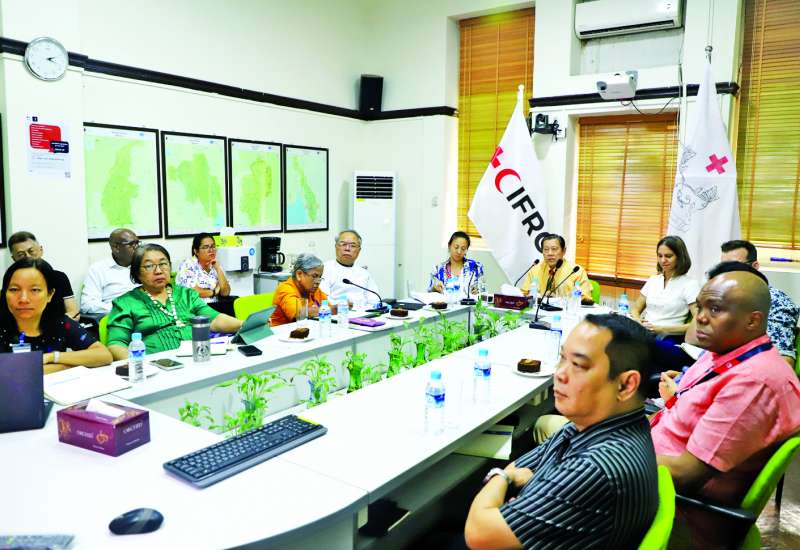 မြန်မာနိုင်ငံ ကြက်ခြေနီအသင်းက ဆောင်ရွက်လျက်ရှိသော ငလျင်တုံ့ပြန်ရေးဆိုင်ရာ Recovery Conference For Myanmar Earthquake ကို ယမန်နေ့မွန်းလွဲပိုင်းက မြန်မာနိုင်ငံကြက်ခြေနီအသင်း ရန်ကုန်ရုံးခွဲတွင် ပြုလုပ်ရာ မြန်မာနိုင်ငံကြက်ခြေနီအသင်းဥက္ကဋ္ဌ ပါမောက္ခဒေါက်တာ မျိုးညွန့်နှင့် အပြည်ပြည်ဆိုင်ရာ ကြက်ခြေနီနှင့် လခြမ်းနီအသင်းများ ဖက်ဒရေးရှင်း (IFRC)မှ Mr. Xavier Castellanos, Under secretary General, National Society Development and Coordination တို့က အမှာစကားပြောကြားသည်။