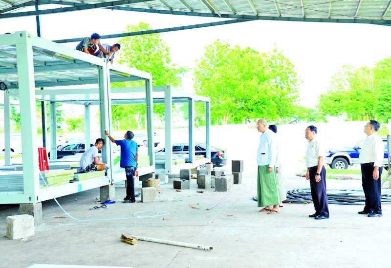 ဟိုတယ်နှင့်ခရီးသွားလာရေးဝန်ကြီးဌာန ပြည်ထောင်စုဝန်ကြီး ဦးကျော်စိုးဝင်းသည် ဒုတိယဝန်ကြီး ဦးဖြိုးဇော်စိုးနှင့်အတူ ယနေ့မွန်းလွဲပိုင်းတွင် ပြည်ထောင်စုနယ်မြေ နေပြည်တော် ဒက္ခိဏသီရိမြို့နယ်အတွင်းရှိ နေပြည်တော်ဟိုတယ်ဆိုင်ရာ လုပ်ငန်းရှင်များအသင်း၏ ရုံးဝင်းအတွင်း၌ ဝန်ကြီးဌာနမှ ငလျင်ဘေးသင့်ဝန်ထမ်းများနှင့် မိသားစုဝင်များ ယာယီနေထိုင်နိုင်ရန်အတွက် အမျိုးသားသဘာဝဘေးအန္တရာယ်ဆိုင်ရာစီမံခန့်ခွဲမှုကော်မတီက ခွဲဝေချထားပေးသည့် အိပ်ခန်းတစ်ခန်းပါ Container House များအားတပ်ဆင် တည်ဆောက်နိုင်ရေး ပြင်ဆင်ဆောင်ရွက်နေမှုအခြေအနေများကို ကြည့်ရှုစစ်ဆေးသည်။