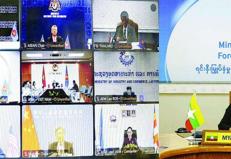 ရင်းနှီးမြှုပ်နှံမှုနှင့် နိုင်ငံခြားစီးပွားဆက်သွယ်ရေးဝန်ကြီးဌာန ဒုတိယဝန်ကြီး ဒေါက်တာဝါဝါမောင် ဦးဆောင်သည့်အဖွဲ့သည် ယမန်နေ့က ဗီဒီယိုကွန်ဖရင့်စနစ်ဖြင့်ကျင်းပသည့် အာဆီယံ-တရုတ် စီးပွားရေးဝန်ကြီးများ အထူးအစည်းအဝေး၊ အာဆီယံ-ဩစတြေးလျ-နယူးဇီလန် စီးပွားရေးဝန်ကြီးများ အထူးအစည်းအဝေးနှင့် အာဆီယံ-ဂျပန် စီးပွားရေးဝန်ကြီးများ အထူးအစည်းအဝေးတို့ကို တက်ရောက်သည်။