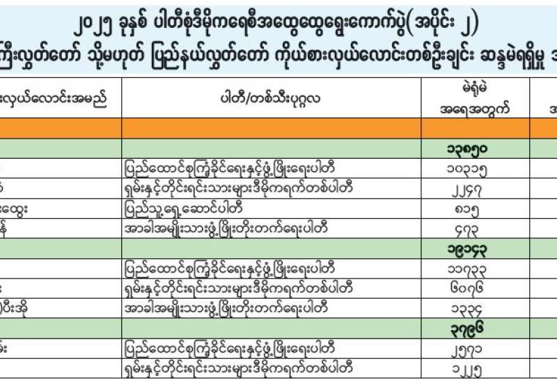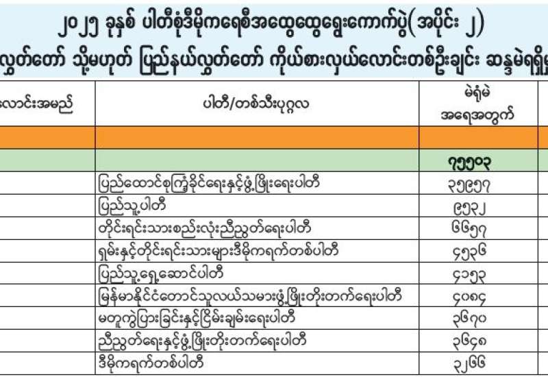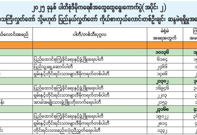 ၂၀၂၅ ခုနှစ် ပါတီစုံဒီမိုကရေစီအထွေထွေရွေးကောက်ပွဲ အပိုင်း (၂) တိုင်းဒေသကြီး/ ပြည်နယ်လွှတ်တော် (အချိုးကျကိုယ်စားပြုစနစ်)၊ ရန်ကုန်တိုင်းဒေသကြီး မဲဆန္ဒနယ်အမှတ် (၅) နိုင်ငံရေးပါတီများ၏ ကိုယ်စားလှယ်လောင်းရရှိမှုအခြေအနေ