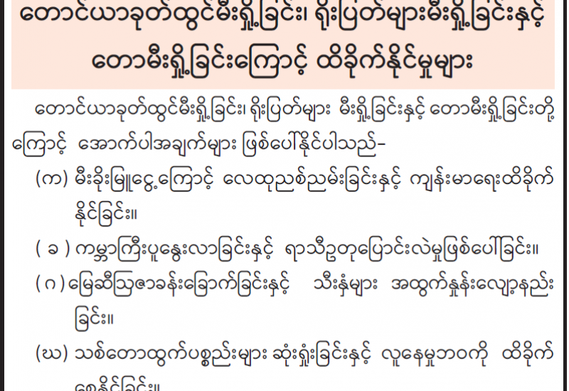 အကြမ်းဖက်အုပ်စုအဖြစ် ကြေညာထားသည့် CRPH ၊ NUG နှင့် ယင်းတို့၏ လက်ဝေခံအဖွဲ့အစည်းများ၊ ယင်းတို့နှင့်ဆက်နွှယ်နေသော အဖွဲ့အစည်းများ၊ လူပုဂ္ဂိုလ်များသည် နိုင်ငံတော်တည်ငြိမ်အေးချမ်းရေးကို ပျက် ပြားစေရန်နှင့် အစိုးရယန္တရားများပျက်ပြားစေရန် ရည်ရွယ်လျက် လှုံ့ဆော်ခြင်း၊ ဝါဒဖြန့်ခြင်းများ ပြုလုပ်ခဲ့မှုအပေါ် ဥပဒေနှင့်အညီ ထိရောက်စွာ အရေးယူသွားမည်ဖြစ်ကြောင်းနှင့် ထိုသို့လှုံ့ဆော်သူ၊ ဝါဒဖြန့်သူများအား ဆက်လက်ဖော်ထုတ်အရေးယူသွားမည်ဖြစ်ကြောင်း မိဘပြည်သူများသိရှိနိုင်ရေး အသိပေးသတင်းထုတ်ပြန်ပြီးဖြစ်သည်။