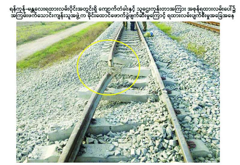 ယနေ့ နံနက် ၇ နာရီအချိန် ကျောက်တံခါးဘူတာမှ ထွက်ခွာလာသော အမှတ် (၉၀၂) အစုန်ကုန်ရထားသည် ရန်ကုန် - မန္တလေးရထားလမ်းပိုင်းအတွင်းရှိ ပဲခူးတိုင်းဒေသကြီး ကျောက်တံခါးမြို့နယ် ကျောက်တံခါးဘူတာနှင့် သူဌေးကုန်းဘူတာအကြား၊ မိုင်တိုင်အမှတ် ၁၀၇/၄-၅ နေရာသို့ ရောက်ရှိချိန်တွင် အစုန်ရထားလမ်းပေါ်၌ အကြမ်းဖက်သောင်းကျန်းသူအဖွဲ့က ထောင်ထားသည့် မိုင်းပေါက်ကွဲမှုကြောင့် အစုန်ရထားလမ်း ထိခိုက်ပျက်စီးနေကြောင်း တွေ့ရှိရသဖြင့် ကျောက်တံခါးဘူတာသို့ ပြန်လည်ဆုတ်ခွာခဲ့ရပြီး ကျောက်တံခါးနှင့် သူဌေးကုန်းရထားလမ်းပိုင်းအား နံနက် ၇ နာရီ ၂၆ မိနစ်တွင် ယာယီပိတ်ထားခဲ့ရကြောင်း သတင်းရရှိသည်။