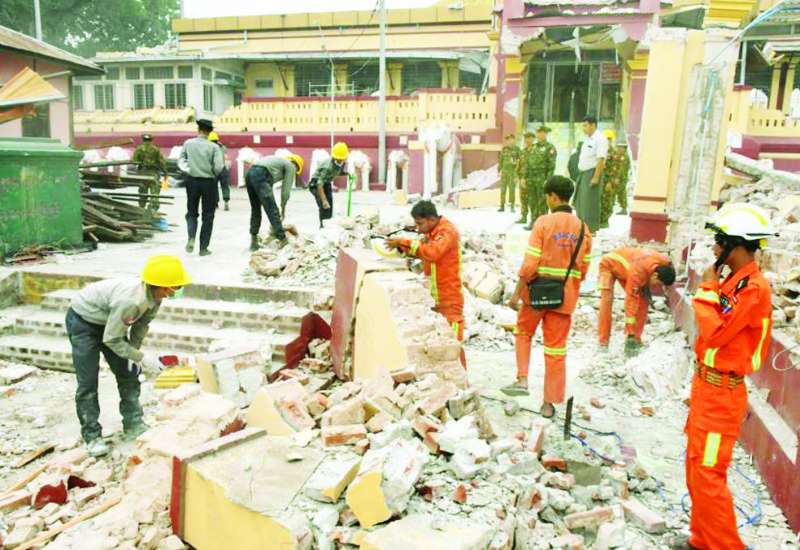 မြန်မာနိုင်ငံတွင် လှုပ်ခတ်ခဲ့သော မန္တလေးငလျင်ကြီးကြောင့် လမ်းတံတား၊ အဆောက်အအုံများ ထိခိုက်ပျက်စီးခဲ့ရသည့်နေရာများ၌ ကူညီကယ်ဆယ်ရေးနှင့် ပြန်လည်ထူထောင်ရေးလုပ်ငန်းများကို တိုင်းစစ်ဌာနချုပ်အသီးသီးမှ တပ်မတော်သားများ၊ မြန်မာနိုင်ငံရဲတပ်ဖွဲ့ဝင်များ၊ မီးသတ်တပ်ဖွဲ့ဝင်များ၊ ပြည်ပနိုင်ငံများမှ ကူညီကယ်ဆယ်ရေးအဖွဲ့များ၊ ဌာနဆိုင်ရာဝန်ထမ်းများ၊ လူမှုကူညီရေးအသင်း/အဖွဲ့များနှင့် ဒေသခံပြည်သူများပူးပေါင်း၍ အချိန်နှင့်တစ်ပြေးညီ ကူညီဆောင်ရွက်ပေးလျက်ရှိသည်။
