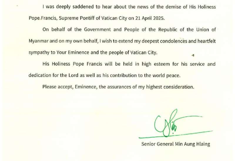 နိုင်ငံတော်စီမံအုပ်ချုပ်ရေးကောင်စီ ဥက္ကဋ္ဌ နိုင်ငံတော်ဝန်ကြီးချုပ် ဗိုလ်ချုပ်မှူးကြီး မင်းအောင်လှိုင်သည် ဗာတီကန်မြို့ပြနိုင်ငံ (Holy See) ၏ ပုပ်ရဟန်းမင်းကြီး ဖရန်စစ် ကွယ်လွန်ခဲ့ခြင်းအတွက် ဗာတီကန်မြို့ပြနိုင်ငံ၊ အစိုးရအဖွဲ့အကြီးအကဲ ဘုန်းတော်ကြီး ပီယဲထရို ပါရိုလင် (His Eminence Cardinal Pietro Parolin)ထံသို့ ယနေ့တွင် ဝမ်းနည်းကြောင်း သဝဏ်လွှာပေးပို့သည်။