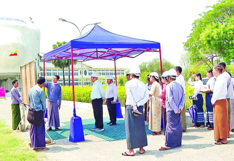 ဟိုတယ်နှင့်ခရီးသွားလာရေးဝန်ကြီးဌာန ပြည်ထောင်စုဝန်ကြီး ဦးကျော်စိုးဝင်းသည် ဒုတိယဝန်ကြီး ဦးဖြိုးဇော်စိုး၊ အမြဲတမ်းအတွင်းဝန်နှင့် အဆင့်မြင့်အရာရှိ ကြီးများနှင့်အတူ ယနေ့နံနက်ပိုင်းတွင် မန္တလေးငလျင်ကြီးဒဏ်ခံခဲ့ရသည့် ဝန်ထမ်းများနှင့် မိသားစုဝင်များ နေထိုင်နိုင်ရန်အတွက် ဝန်ကြီးဌာနရုံးအနီးတွင် နှစ်ခန်းတွဲဘာရှာအဆောက်အအုံများ ဆောက်လုပ်ရန် စီစဉ်ဆောင်ရွက်ထားသည့် မြေနေရာသို့ သွားရောက်ကာ နှစ်ခန်းတွဲဘာရှာအဆောက်အအုံများ တည်ဆောက်ရန် နေရာချထားမှုများ၊ မြေညှိခြင်း ဆောင်ရွက်ထားမှုများကို ကြည့်ရှုစစ်ဆေးသည်။