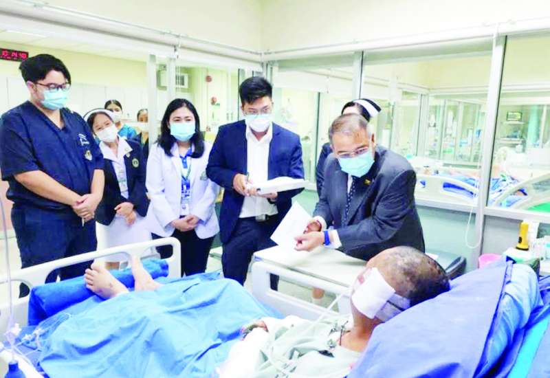 မတ် ၂၈ ရက်က ထိုင်းနိုင်ငံ ဗန်ကောက်မြို့ Khet Chatuchak နယ်မြေ၌ မြေငလျင်လှုပ်ခတ်၍ ဆောက်လုပ်ဆဲ အဆောက်အအုံ ပြိုကျပျက်စီးမှုကြောင့် ထိခိုက်ဒဏ်ရာရရှိ၍ ဆေးကုသမှုခံယူနေသော မြန်မာအလုပ်သမားများအား နိုင်ငံတော်အကြီးအကဲ၏ လမ်းညွှန်ချက်နှင့်အညီ ထိုင်းနိုင်ငံဆိုင်ရာ မြန်မာသံအမတ်ကြီးက ဧပြီ ၉ ရက်တွင် သွားရောက် အားပေးစကား ပြောကြားပြီး ထောက်ပံ့ငွေပေးအပ်ခဲ့ကြောင်း သိရသည်။