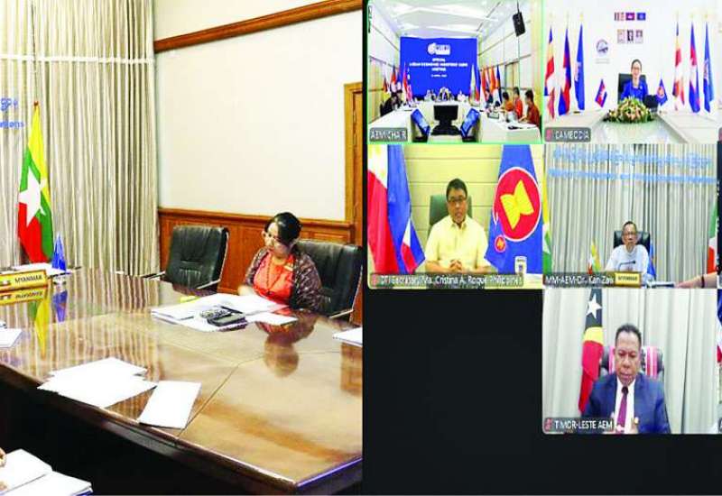 ယနေ့နံနက်ပိုင်းတွင် ဗီဒီယိုကွန်ဖရင့်စနစ်ဖြင့် ကျင်းပသည့် အာဆီယံစီးပွားရေးဝန်ကြီးများ အထူးအစည်းအဝေးသို့ မြန်မာနိုင်ငံ၏ အာဆီယံစီးပွားရေးဝန်ကြီး၊ ရင်းနှီးမြှုပ်နှံမှုနှင့် နိုင်ငံခြားစီးပွားဆက်သွယ်ရေးဝန်ကြီးဌာန ပြည်ထောင်စုဝန်ကြီး ဒေါက်တာကံဇော် ဦးဆောင်သည့် ကိုယ်စားလှယ်အဖွဲ့ ပါဝင်တက်ရောက်သည်။
