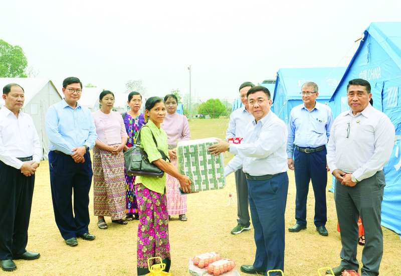 သယံဇာတနှင့် သဘာဝပတ်ဝန်းကျင်ထိန်းသိမ်းရေးဝန်ကြီးဌာန ပြည်ထောင်စုဝန်ကြီး ဦးခင်မောင်ရီသည် မန္တလေးတိုင်းဒေသကြီးအတွင်း ငလျင်ဒဏ်သင့်ဝန်ကြီးဌာနအောက်ရှိ ဌာန၊ လုပ်ငန်းရုံးအဆောက်အအုံနှင့် ဝန်ထမ်းနေအိမ်များကို ကြည့်ရှုစစ်ဆေးပြီး ဝန်ထမ်းမိသားစုများနှင့် တွေ့ဆုံအားပေးကာ ထောက်ပံ့ငွေနှင့် ပစ္စည်းများ ပေးအပ်သည်။