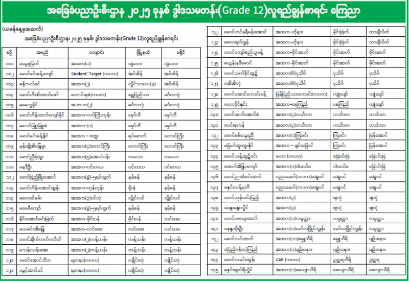 အခြေခံပညာဦးစီးဌာန ၂၀၂၅ ခုနှစ် ဒွါဒသမတန်း(Grade 12)လူရည်ချွန်စာရင်း ကြေညာ