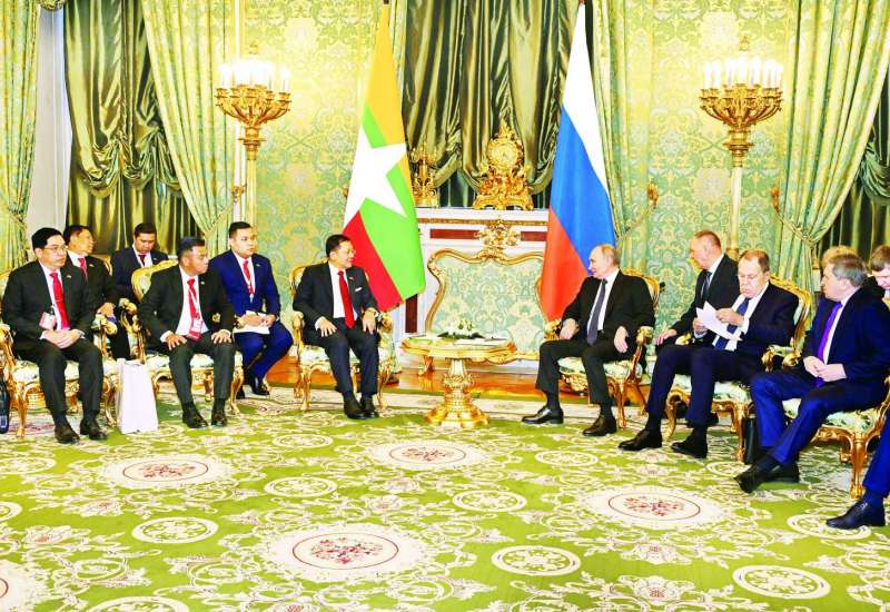 ရုရှားဖက်ဒရေးရှင်းနိုင်ငံသမ္မတ H.E. Vladimir Vladimirovich Putin ၏ ဖိတ်ကြားချက်အရ ရုရှားဖက်ဒရေးရှင်းနိုင်ငံသို့ တရားဝင်ချစ်ကြည်‌ရေးခရီးရောက်ရှိနေသည့် နိုင်ငံတော်စီမံအုပ်ချုပ်ရေးကောင်စီဥက္ကဋ္ဌ နိုင်ငံတော်ဝန်ကြီးချုပ် ဗိုလ်ချုပ်မှူးကြီး မင်းအောင်လှိုင်သည် ယနေ့ဒေသစံတော်ချိန် ညနေပိုင်းတွင် မော်စကိုမြို့၊ ကရင်မလင်နန်းတော်၌ ရုရှားဖက်ဒရေးရှင်းနိုင်ငံသမ္မတ H.E. Vladimir Vladimirovich Putin နှင့် သီးခြားတွေ့ဆုံဆွေးနွေးသည်။