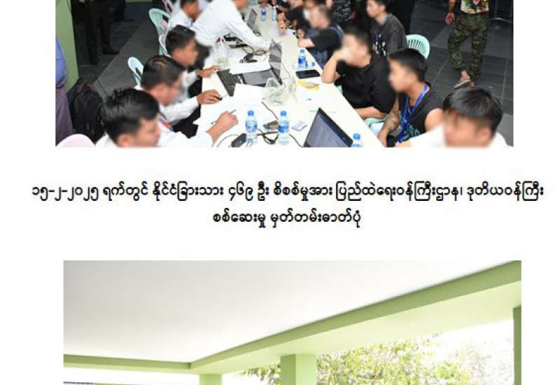 ထိုင်းနိုင်ငံအပါအဝင် အိမ်နီးချင်းနိုင်ငံအချို့ကို တစ်ဆင့်ခံဖြတ်သန်း၍ မြန်မာနိုင်ငံအတွင်းသို့ နယ်စပ်လမ်းကြောင်းများမှတစ်ဆင့် တရားမဝင် ဝင်ရောက်လာပြီး ကရင်ပြည်နယ် မြဝတီမြို့- ရွှေကုက္ကိုလ်နှင့် KK Park နယ်မြေများတွင် တရားမဝင် Online လောင်းကစားမှုများ၊ Online လိမ်လည်မှုများ၊ ဒုစရိုက်မှုများ ကျူးလွန်ခဲ့ကြသူများကို စစ်ဆေးဖော်ထုတ်လျက်ရှိရာ ဇန်နဝါရီ ၃၀ ရက်မှ ဖေဖော်ဝါရီ ၁၅ ရက်အထိပြည်ပနိုင်ငံသား ၇၉၉ ဦးကို ထိန်းသိမ်းနိုင်ခဲ့ကြောင်း သိရသည်။