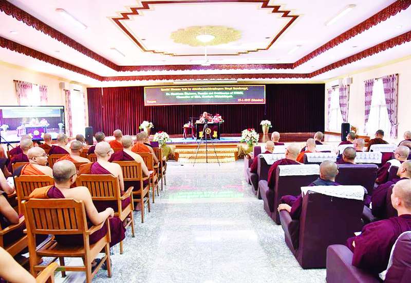 နိုင်ငံတော်သြဝါဒါစရိယ ရွှေကျင်နိကာယာဓိပတိ ရွှေကျင်သာသနာပိုင် သီတဂူကမ္ဘာ့ဗုဒ္ဓတက္ကသိုလ်များ၏အဓိပတိ အပြည်ပြည်ဆိုင်ရာ ထေရဝါဒဗုဒ္ဓသာသနာပြု တက္ကသိုလ်တည်ထောင်သူနှင့် သြဝါဒါစရိယအဖွဲ့ဝင် အဘိဓဇမဟာရဋ္ဌဂုရု အဘိဓဇအဂ္ဂမဟာ သဒ္ဓမ္မဇောတိက သီတဂူဆရာတော် ဒေါက်တာဘဒ္ဒန္တဉာဏိဿရသည် အပြည်ပြည်ဆိုင်ရာထေရဝါဒဗုဒ္ဓသာသနာပြု တက္ကသိုလ်၌ ၂၀၂၄-၂၀၂၅ ပညာသင်နှစ် ဒီပလိုမာတန်းမှ ပါရဂူတန်းအထိ တက်ရောက်လျက်ရှိသော ပြည်တွင်းပြည်ပမှ သင်တန်းသားသင်တန်းသူများအား ယနေ့မွန်းလွဲပိုင်းတွင် အပြည်ပြည်ဆိုင်ရာထေရဝါဒ ဗုဒ္ဓသာသနာပြုတက္ကသိုလ် Seminar Hall တွင် Special Dhamma Talk ပို့ချသည်။
