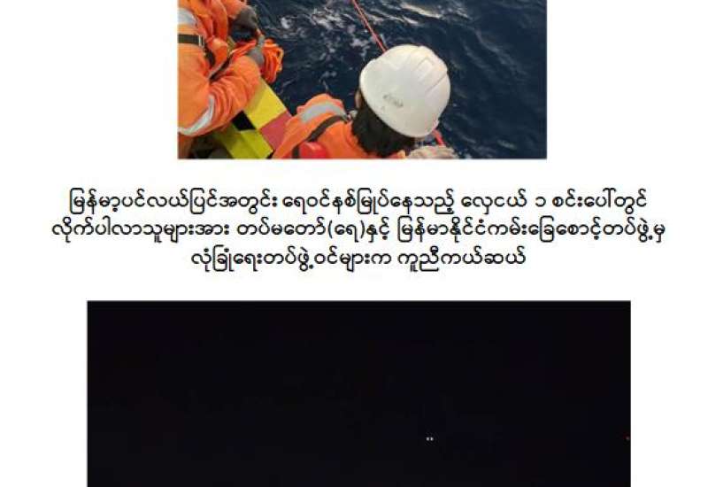 ရန်ကုန်တိုင်းဒေသကြီး၊ ရန်ကုန်မြို့၏ တောင်ဘက် ရေမိုင် ၁၅၆ မိုင်ခန့်အကွာရှိ မြန်မာ့ပင်လယ်ပြင်အတွင်း ရေဝင်နစ်မြုပ်နေသည့် လှေတစ်စင်းပေါ်မှ လိုက်ပါလာသူများအား တပ်မတော် (ရေ) နှင့် မြန်မာနိုင်ငံကမ်းခြေစောင့်တပ်ဖွဲ့မှ လုံခြုံရေးတပ်ဖွဲ့ဝင်များက ကူညီကယ်ဆယ်ရေးလုပ်ငန်းများ ဆောင်ရွက်ပေးခဲ့ကြောင်း သိရှိရသည်။