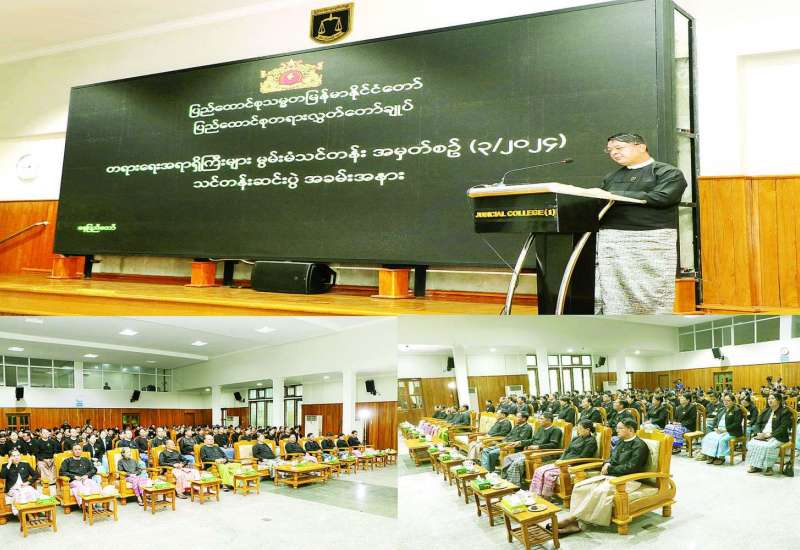 ဒုတိယမြို့နယ် တရားသူကြီးများ လုပ်ငန်းဝင်သင်တန်း အမှတ်စဉ် (၃၃) သင်တန်းဆင်းပွဲနှင့် ကျမ်းသစ္စာပြုပွဲ အခမ်းအနားကို ဒီဇင်ဘာ ၂၇ ရက် နံနက်ပိုင်းက ပြည်ထောင်စုတရားလွှတ်တော် ချုပ် Judicial College ၌ကျင်းပရာ ပြည်ထောင်စုတရားသူကြီးချုပ် ဦးသာဌေးတက်ရောက်၍ သင်တန်းဆင်းအမှာစကားပြောကြားခဲ့သည်။