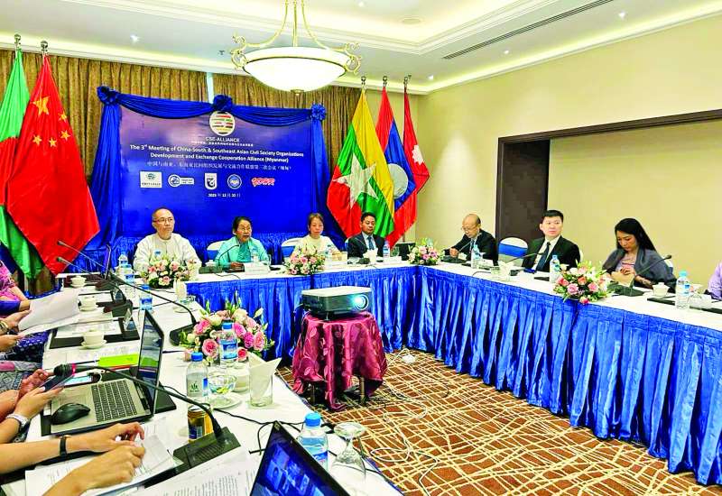 ဒေသတွင်း NGO အဖွဲ့အစည်းများ လူမှုဘဝတိုးတက်ဖွံ့ဖြိုးရေးလုပ်ငန်းများ ပူးပေါင်းဆောင်ရွက်ရန် မြန်မာ၊ တရုတ်၊ ဘင်္ဂလားဒေ့ရှ်၊ ကမ္ဘောဒီးယား၊ လာအို၊ နီပေါ(၆)နိုင်ငံမှ လူမှုရေး အသင်းအဖွဲ့များက ၂၀၂၅ ခုနှစ်အောက်တိုဘာ ၁ ရက်တွင် ကမ္ဘောဒီးယားနိုင်ငံ ဖနွမ်းပင်မြို့၌ စတင်ဖွဲ့စည်းခဲ့သည့် “တရုတ်-တောင်အာရှနှင့် အရှေ့တောင်အာရှ ပြည်သူ့လူမှုရေးအဖွဲ့အစည်းများ ဖွံ့ဖြိုးတိုးတက်ရေးနှင့် အပြန်အလှန် ပူးပေါင်းဆောင်ရွက်ရေးမဟာမိတ်အဖွဲ့ ”(China South & Southeast Asian Civil Society Organizations Development and Exchange Cooperation Alliance) ၏ တတိယအကြိမ်မြောက်ကျင်းပသည့် အွန်လိုင်းအစည်းအဝေးကို မြန်မာနိုင်ငံရှိ မြန်မာ-တရုတ် ပူးပေါင်းဆက်ဆံရေးအသင်းက စီစဉ်လျက် ဒီဇင်ဘာ ၂၂ ရက်တွင် ရန်ကုန်မြို့ ဆီဒိုးနားဟိုတယ်၌ အွန်လိုင်းစနစ်ဖြင့် ကျင်းပသည်။