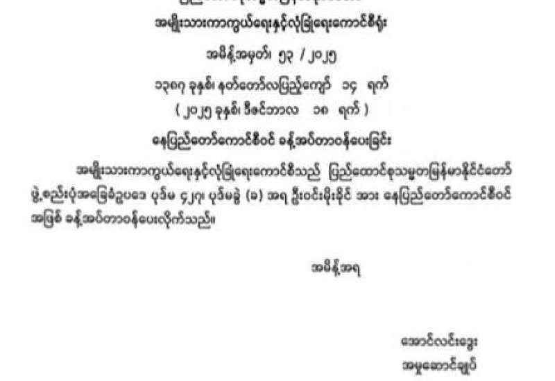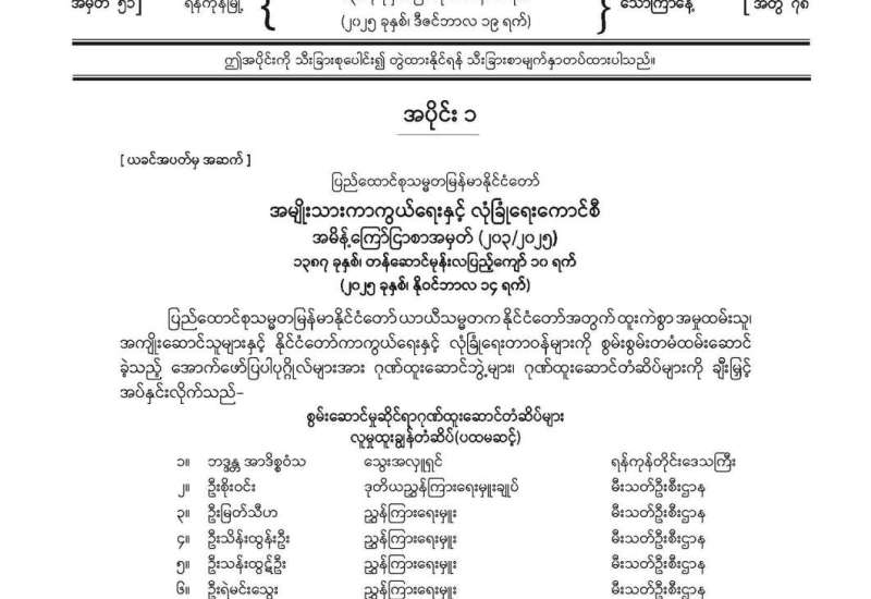 ပြည်ထောင်စုသမ္မတမြန်မာနိုင်ငံတော် ပြန်တမ်း အတွဲ (၇၈) အမှတ် (၅၁) အပိုင်း (၁) အား ဖတ်ရှုနိုင်ပါသည်-
