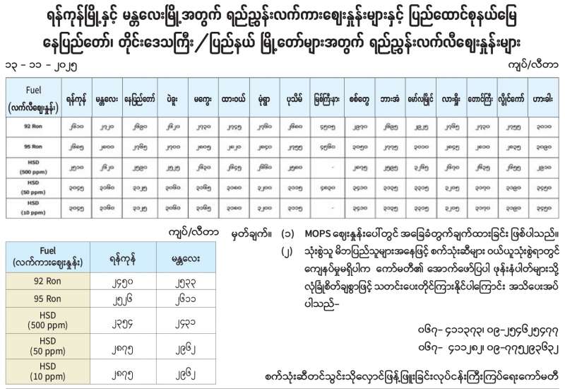 ရန်ကုန်မြို့နှင့် မန္တလေးမြို့အတွက် ရည်ညွှန်းလက်ကားဈေးနှုန်းများနှင့် ပြည်ထောင်စုနယ်မြေ နေပြည်တော်၊ တိုင်းဒေaသကြီး/ပြည်နယ် မြို့တော်များအတွက် ရည်ညွှန်းလက်လီဈေးနှုန်းများ