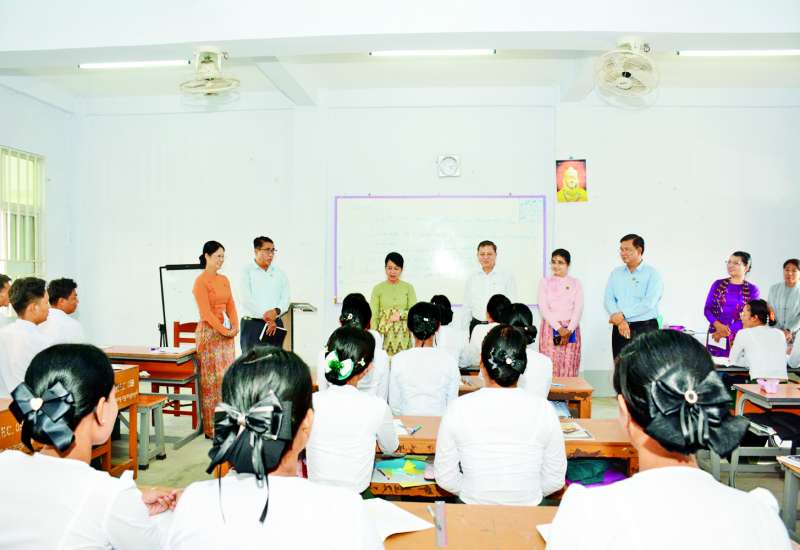 အလုပ်သမားဝန်ကြီးဌာန ဒုတိယဝန်ကြီး ဦးဝင်းရှိန်သည် ယနေ့နံနက်ပိုင်းတွင် ရန်ကုန်တိုင်းဒေသကြီးရှိ အလုပ်သမားရေးရာ တာဝန်ရှိသူများနှင့်အတူ ကမာရွတ်မြို့နယ်ရှိ National Management Academy တွင် ဟိုတယ်လုပ်ငန်းဆိုင်ရာ အသက်မွေးပညာသင်တန်းများ ဖွင့်လှစ်ပို့ချနေမှုများကို ကြည့်ရှုအားပေးသည်။