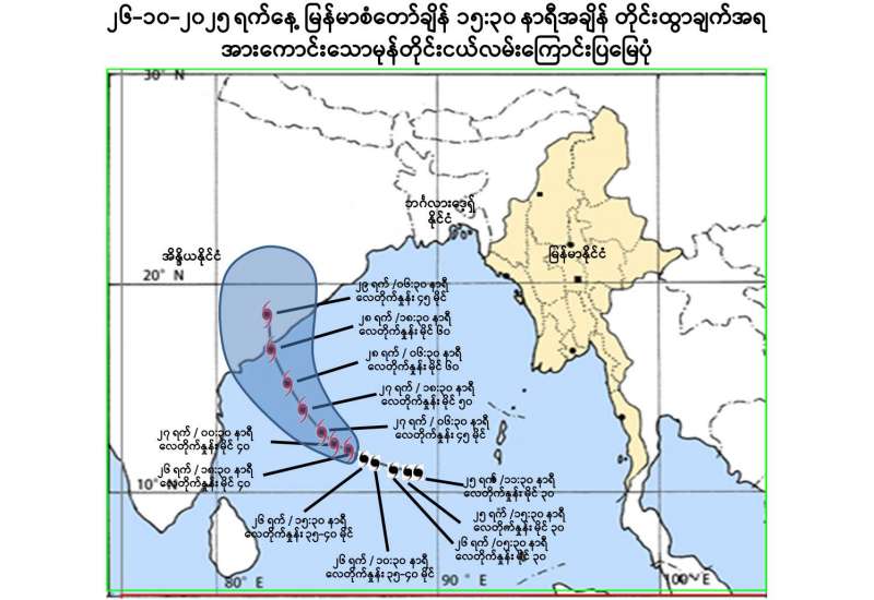 ဘင်္ဂလားပင်လယ်အော်အခြေအနေ။ ယနေ့မြန်မာစံတော်ချိန် ၀၅:၃၀ နာရီအချိန် တိုင်းထွာချက်များအရ ဘင်္ဂလားပင်လယ်အော် အရှေ့တောင်ပိုင်းတွင် ဖြစ်ပေါ်နေသော မုန်တိုင်းငယ် (Depression) သည် ဆက်လက်တည်ရှိနေပါသည်။ အဆိုပါ မုန်တိုင်းငယ် သည် မြန်မာနိုင်ငံ၊ ကိုကိုးကျွန်းမြို့ (Coco Island) ၏ အနောက်တောင်ဘက် ရေမိုင် ၄၀၀ မိုင်ခန့်၊ အိန္ဒိယနိုင်ငံ၊ ချင်းနိုင်မြို့ (Chennai) ၏ အရှေ့-အရှေ့တောင်ဘက် ရေမိုင် ၄၃၀ မိုင်ခန့်၊ ကာကီနာဒါမြို့ (Kakinada) ၏ အရှေ့တောင်ဘက် ရေမိုင် ၄၆၀ မိုင်ခန့်အကွာ ပင်လယ်ပြင်ကို ဗဟိုပြုနေပါသည်။ အဆိုပါ မုန်တိုင်းငယ်သည် အနောက်-အနောက်မြောက်ဘက်သို့ ရွေ့လျားနိုင်ပြီး နောက် ၆ နာရီအတွင်း အားကောင်းသောမုန်တိုင်းငယ် (Deep Depression) အဖြစ်သို့လည်းကောင်း၊ ၂၇-၁၀-၂၀၂၅ ရက်နေ့၌ ဘင်္ဂလားပင်လယ်အော်အနောက်တောင်ပိုင်းတွင် ဆိုင်ကလုန်းမုန်တိုင်း (Cyclonic Storm) အဖြစ်သို့လည်းကောင်း၊ ၂၈-၁၀-၂၀၂၅ ရက်နေ့၌ အားကောင်းသောဆိုင်ကလုန်းမုန်တိုင်း (Severe Cyclonic Storm) အဖြစ်သို့လည်းကောင်း ရောက်ရှိ နိုင်ကာ ယင်းနေ့ညပိုင်းတွင် အင်ဒရာပရာဒေ့ရှ်ကမ်းခြေကို ဖြတ်ကျော်နိုင်သည်ဟု ခန့်မှန်းရပါသည်။ ကပ္ပလီပင်လယ်ပြင် မြောက်ပိုင်း၊ ဘင်္ဂလားပင်လယ်အော်မြောက်ပိုင်းနှင့် အရှေ့အလယ်ပိုင်းတို့တွင် တိမ်အနည်းငယ် ဖြစ်ထွန်းနေပြီး ကပ္ပလီ ပင်လယ်ပြင်တောင်ပိုင်းတွင် တိမ်အသင့်အတင့် ဖြစ်ထွန်းနေကာ ကျန်ဘင်္ဂလားပင်လယ်အော်တွင် တိမ်ထူထပ်နေပါသည်။