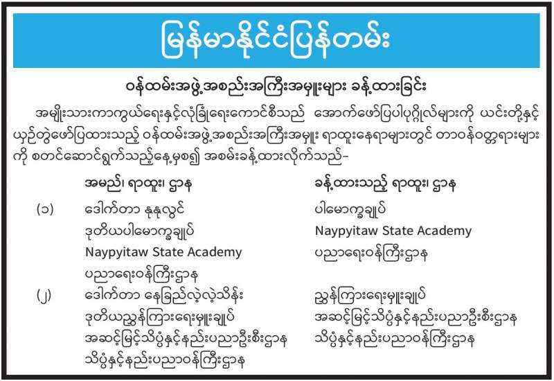 မြန်မာနိုင်ငံစာရင်းကောင်စီက ကြီးမှူးကျင်းပသည့် လက်မှတ်ရပြည်သူ့စာရင်းကိုင် (Certified Public Accountant – CPA) (ဒုတိယပိုင်း) သင်တန်းအမှတ်စဉ် (၄၈) သင်တန်းဖွင့်ပွဲကို ယနေ့နံနက်ပိုင်းတွင် နေပြည်တော်ရှိ ပြည်ထောင်စုစာရင်းစစ်ချုပ်ရုံး နဝရတ်ခန်းမ၌ Hybrid စနစ်ဖြင့် ကျင်းပသည်။