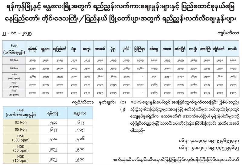 ရန်ကုန်မြို့နှင့် မန္တလေးမြို့အတွက် ရည်ညွှန်းလက်ကားဈေးနှုန်းများနှင့် ပြည်ထောင်စုနယ်မြေ နေပြည်တော်၊ တိုင်းဒေသကြီး/ပြည်နယ် မြို့တော်များအတွက် ရည်ညွှန်းလက်လီစျေးနှုန်းများ
