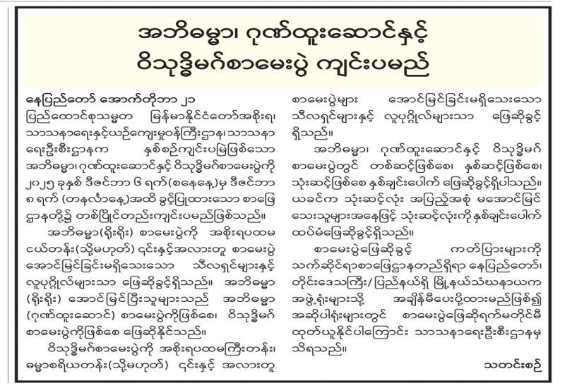 အဘိဓမ္မာ၊ ဂုဏ်ထူးဆောင်နှင့်ဝိသုဒ္ဓိမဂ်စာမေးပွဲ ကျင်းပမည်