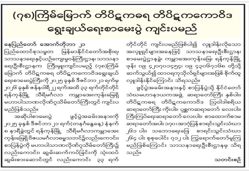 (၇၈)ကြိမ်မြောက် တိပိဋကဓရ တိပိဋကကောဝိဒရွေးချယ်ရေးစာမေးပွဲ ကျင်းပမည်