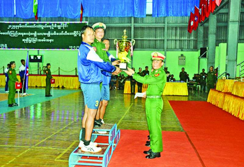 ၂၀၂၅ ခုနှစ် တပ်မတော်ကာကွယ်ရေးဦးစီးချုပ်ဒိုင်း တပ်မတော် (ကြည်း၊ ရေ၊ လေ) (အမျိုးသား/အမျိုးသမီး) ဘော်လီဘောပြိုင်ပွဲ ဗိုလ်လုပွဲနှင့် ဆုချီးမြှင့်ခြင်းကို ယနေ့မွန်းလွဲပိုင်းတွင် အရှေ့ပိုင်းတိုင်းစစ်ဌာနချုပ် အားကစားခန်းမ၌ ပြုလုပ်ရာ တိုင်းမှူး ဗိုလ်မှူးချုပ် နိုင်ဇော်ဦးနှင့် တာဝန်ရှိသူများ၊ အရာရှိ၊ စစ်သည်၊ မိသားစုဝင်များ၊ ပြိုင်ပွဲဝင်အားကစားသမားများ၊ ဒိုင်အဖွဲ့ဝင်များ၊ အားကစားဝါသနာရှင်များနှင့် ဖိတ်ကြားထားသူများ တက်ရောက်ကြသည်။