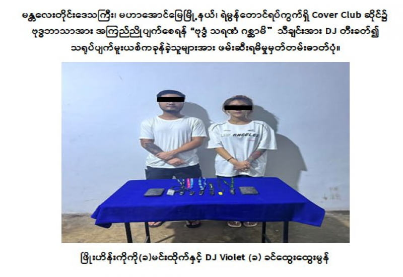 မန္တလေးတိုင်းဒေသကြီး၊ မဟာအောင်မြေမြို့နယ်၊ ရဲမွန်တောင်ရပ်ကွက်၊ ၃၆ လမ်းနှင့် ၃၆ x ၅၃ လမ်းထောင့်ရှိ Cover Club ဆိုင်၌ ၂၀၂၅ ခုနှစ်၊ ဇူလိုင်လ ၃၁ ရက်နေ့ နံနက် ၁ နာရီမှ ၂ နာရီအချိန်ထိ DJ Violet (ခ) ခင်ထွေးထွေးမွန်(၂၄)နှစ်နှင့် DJ မန်နေဂျာဖြစ်သူ ဖြိုးဟိန်းကိုကို (ခ)မင်းထိုက်နှင့် Dice (ခ)ဉာဏ်လင်းထက်တို့ ဦးဆောင်၍ “ဗုဒ္ဓံ သရဏံ ဂစ္ဆာမိ” သီချင်းအား အရက်သေစာသောက်စားမူးယစ်၍ သရုပ်ပျက်အဝတ်အစားများဝတ်ဆင်ကာ DJ တီးခတ်ကခုန်ခဲ့မှုကြောင့် ဗုဒ္ဓဘာသာအား အကြည်ညိုပျက်စေရန် ပြုလုပ်ခဲ့ကြောင်း တွေ့ရှိရသဖြင့် အရေးယူဆောင်ရွက်နိုင်ရေး ရှာဖွေဖမ်းဆီးခဲ့ရာ DJ တီးခတ်သူ DJ Violet (ခ) ခင်ထွေးထွေးမွန်(၂၄)နှစ်နှင့် DJ မန်နေဂျာဖြစ်သူ ဖြိုးဟိန်းကိုကို(ခ)မင်းထိုက်(၂၈)နှစ်တို့ကို စက်တင်ဘာ ၁၁ ရက် ည ၁၁ နာရီ မိနစ် ၃၀ ခန့်တွင် ရန်ကုန်တိုင်းဒေသကြီး၊ သင်္ဃန်းကျွန်းမြို့နယ်၊ နနွင်းကုန်းရပ်ကွက်နေအိမ်၌လည်းကောင်း၊ ဆိုင်ပိုင်ရှင် သက်လွင်အောင်(ခ)မျိုးအောင်(၄၉)နှစ်၊ ဆိုင်မန်နေဂျာ ဇင်စုရ(၃၁)နှစ်တို့ကို ယနေ့မွန်းလွဲ ၁ နာရီခန့်တွင် မန္တလေးတိုင်းဒေသကြီး၊ မဟာအောင်မြေမြို့နယ်၊ ရဲမွန်တောင်ရပ်ကွက်၊ ၃၆ လမ်းနှင့် ၃၆ x ၅၃ လမ်းထောင့်ရှိ Cover Club ဆိုင်၌လည်းကောင်း အသီးသီးဖမ်းဆီးရမိခဲ့ကြောင်း မြန်မာနိုင်ငံရဲတပ်ဖွဲ့မှ သိရှိရသည်။