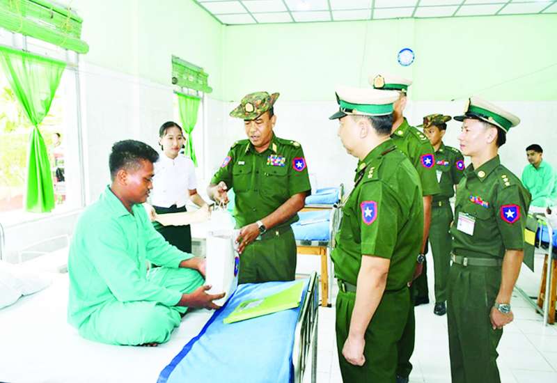 ကချင်ပြည်နယ် မြစ်ကြီးနားမြို့ရှိ တပ်မတော်ဆေးရုံ၊ ရန်ကုန်တိုင်းဒေသကြီး မင်္ဂလာဒုံမြို့နယ်ရှိ တပ်မတော်အရိုးရောဂါအထူးကု ဆေးရုံကြီး (ခုတင်-၅၀၀)နှင့် တပ်မတော်ဆေးရုံကြီး (ခုတင်-၁၀၀၀)၊ မန္တလေးတိုင်းဒေသကြီး မန္တလေးမြို့၊ နန်းမြို့တွင်း၊ ပြင်ဦးလွင်မြို့နှင့် မိတ္ထီလာမြို့တို့ရှိ တပ်မတော်ဆေးရုံများ၊ ပဲခူးတိုင်းဒေသကြီး ပြည်မြို့ရှိ တပ်မတော်ဆေးရုံတို့၌ တက်ရောက်ဆေးကုသ မှုခံယူလျက်ရှိသော အရာရှိ၊ စစ်သည်၊ မိသားစုဝင်များ၊ စစ်မှုထမ်းဟောင်းအဖွဲ့ဝင်များ၊ မြန်မာနိုင်ငံ ရဲတပ်ဖွဲ့ဝင်များ၊ ပြည်သူ့စစ် (ဌာနေ) တပ်ဖွဲ့ဝင်များနှင့် ဒေသခံပြည်သူများအား ယမန်နေ့တွင် သက်ဆိုင်ရာ တိုင်းစစ်ဌာနချုပ်များမှ တိုင်းမှူးများနှင့် တာဝန်ရှိသူများက သွားရောက်ကြည့်ရှု၍ တစ်ဦးချင်း၏ ရောဂါဖြစ်ပွားမှု၊ ဆေးဝါးကုသပေးထားမှုနှင့် ကျန်းမာရေးတိုးတက်ကောင်းမွန်မှု အခြေအနေများကို မေးမြန်းအားပေးစကား ပြောကြားပြီး အာဟာရဖြည့် စားသောက်ဖွယ်ရာများ ပေးအပ်သည်။