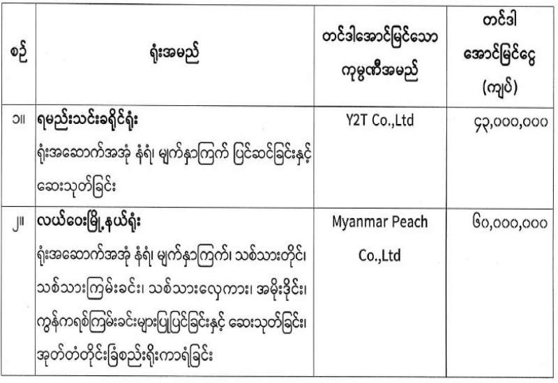 ၁။ လိုင်စင်ဆိုင်ရာ အခကြေးငွေများပေးသွင်းခြင်းနှင့် လုပ်ငန်းအစီရင်ခံစာများပေးပို့ခြင်းတို့အား ဆောင်ရွက်ရန်ပျက်ကွက်လျက်ရှိသည့် အောက်ဖော်ပြပါဆက်သွယ်ရေးဝန်ဆောင်မှု လုပ်ငန်းလိုင်စင်ကို ၂၀-၂-၂၀၂၃ နေ့တွင်ရရှိသော ကုမ္ပဏီများသည်ဆက်သွယ်ရေးဥပဒေပုဒ်မ ၁၅ အရ လိုင်စင်ရရှိသူ၏ တာဝန်များအား လိုက်နာရန်ပျက်ကွက်ခြင်းကြောင့် စီမံခန့်ခွဲရေးနည်းလမ်းဖြင့် အရေးယူသွားမည်ဖြစ်၍ လိုင်စင်ထုတ်ပေးခြင်းဆိုင်ရာ နည်းဥပဒေများ အပိုဒ် ၃၉ (က) (၂) အရ ထိုက်သင့်သော အခွင့်အရေးပေးသည့်အနေဖြင့် ၂၀၂၅ ခုနှစ်၊ စက်တင်ဘာလ (၁၂) ရက်နေ့ နောက်ဆုံးထားပြီး ဆက်သွယ်ရေးညွှန်ကြားမှုဦးစီးဌာနသို့ ဖြေရှင်းချက်နှင့်အတူ သက်ဆိုင်ရာအခကြေးငွေများ လာရောက်ပေးသွင်းပါရန်နှင့် သတ်မှတ်ရက်အတွင်း ပေးသွင်းခြင်းမရှိပါက ဆက်သွယ်ရေးဥပဒေ၊ နည်းဥပဒေပါ ပြဋ္ဌာန်းချက်များနှင့်အညီ အရေးယူမှုများကို ဆက်လက်ပြုလုပ်သွားမည်ဖြစ်ပါကြောင်း အသိပေးအကြောင်းကြားပါသည်-