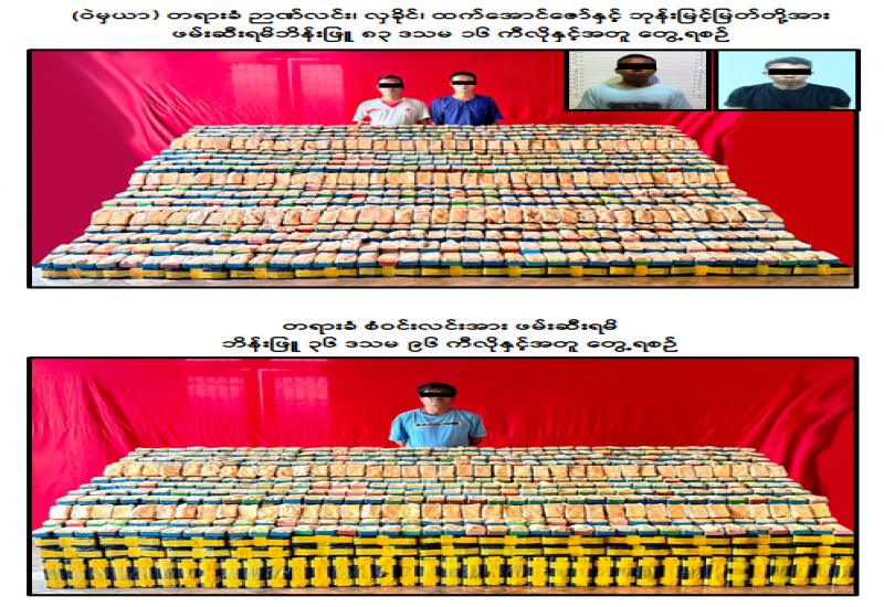 မူးယစ်ဆေးဝါးတားဆီးနှိမ်နင်းရေးရဲတပ်ဖွဲ့မှ တပ်ဖွဲ့ဝင်များပါဝင်သော ပူးပေါင်းအဖွဲ့သည် ဩဂုတ်လ ၂၅ ရက်နေ့ ည ၇ နာရီခွဲအချိန်သတင်းအရ မန္တလေးတိုင်းဒေသကြီး၊ ကျောက်ဆည်ခရိုင်၊ မြစ်သားမြို့နယ်၊ အမှတ် (၃) ခရိုင် ချင်းဆက်လမ်း၌ ဉာဏ်လင်းမောင်းနှင်ပြီး လှခိုင်လိုက်ပါလာသော TOYOTA LITEACE မော်တော်ယာဉ်၊ စံဝင်းလင်းမောင်းနှင်သည့် IZONE မော်တော်ယာဉ်နှင့် ထက်အောင်ဇော်မောင်းနှင်သည့် ဆိုင်ကယ်တို့အား စစ်ဆေးရှာဖွေရာ မော်တော်ယာဉ် ၂ စီးပေါ်မှ ဘိန်းဖြူအလေးချိန် ၁၂၀ ဒသမ ၁၂ ကီလို (၎င်းဒေသတန်ဖိုးငွေကျပ် ၃ ဒသမ ၀၀၃ ဘီလီယံ) အား ဖမ်းဆီးရမိခဲ့ကြောင်း၊